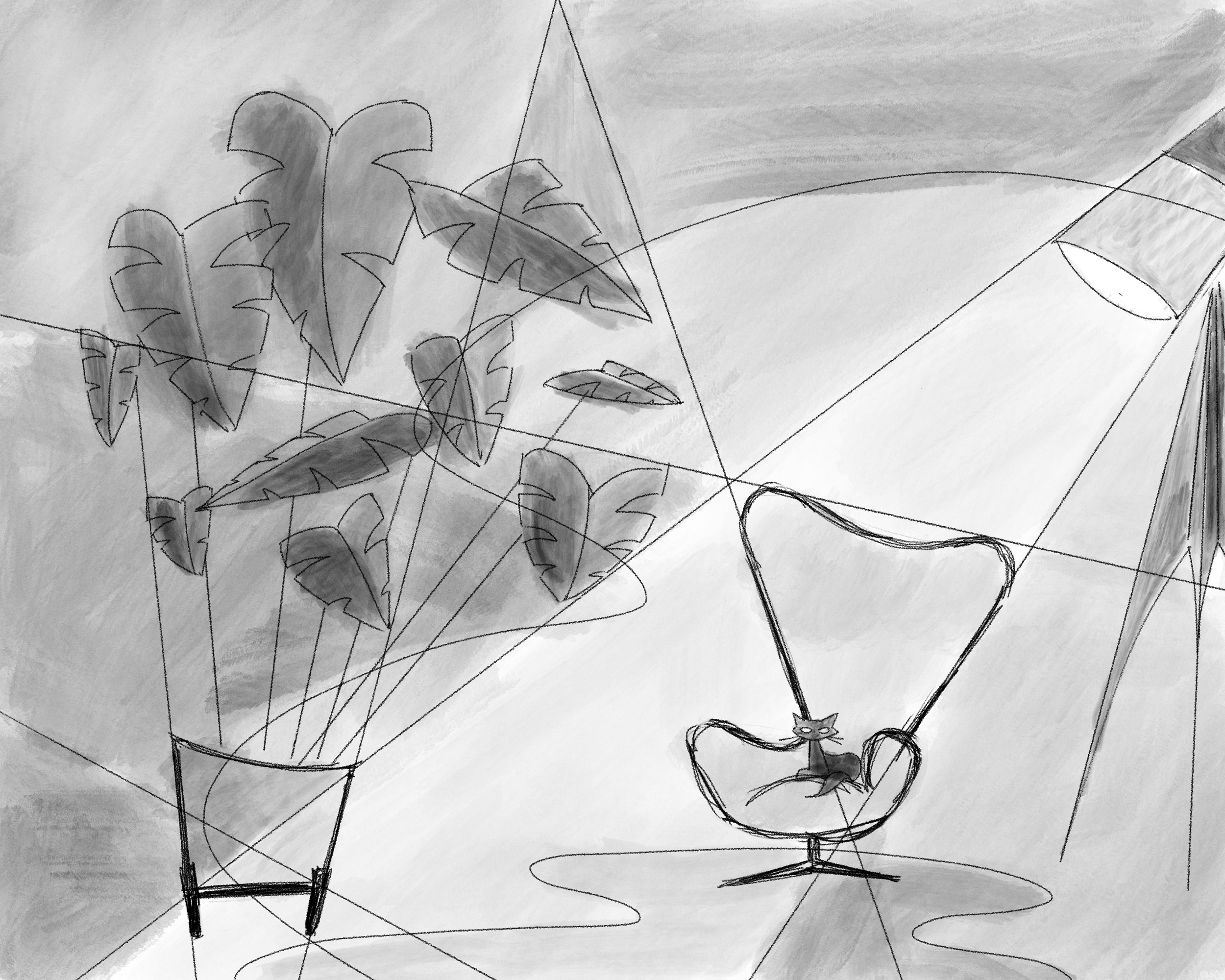 When conceptualizing this funky interior, I challenged myself to create an asymmetrically balanced composition. I had a fun time playing with value and shape relationships and how they can create emphasis. Coming up with angular designs based on the work of Shag, an amazing mid-century style artist, was also a blast. It’s intriguing how a simple circle and triangle can become a moody scene!