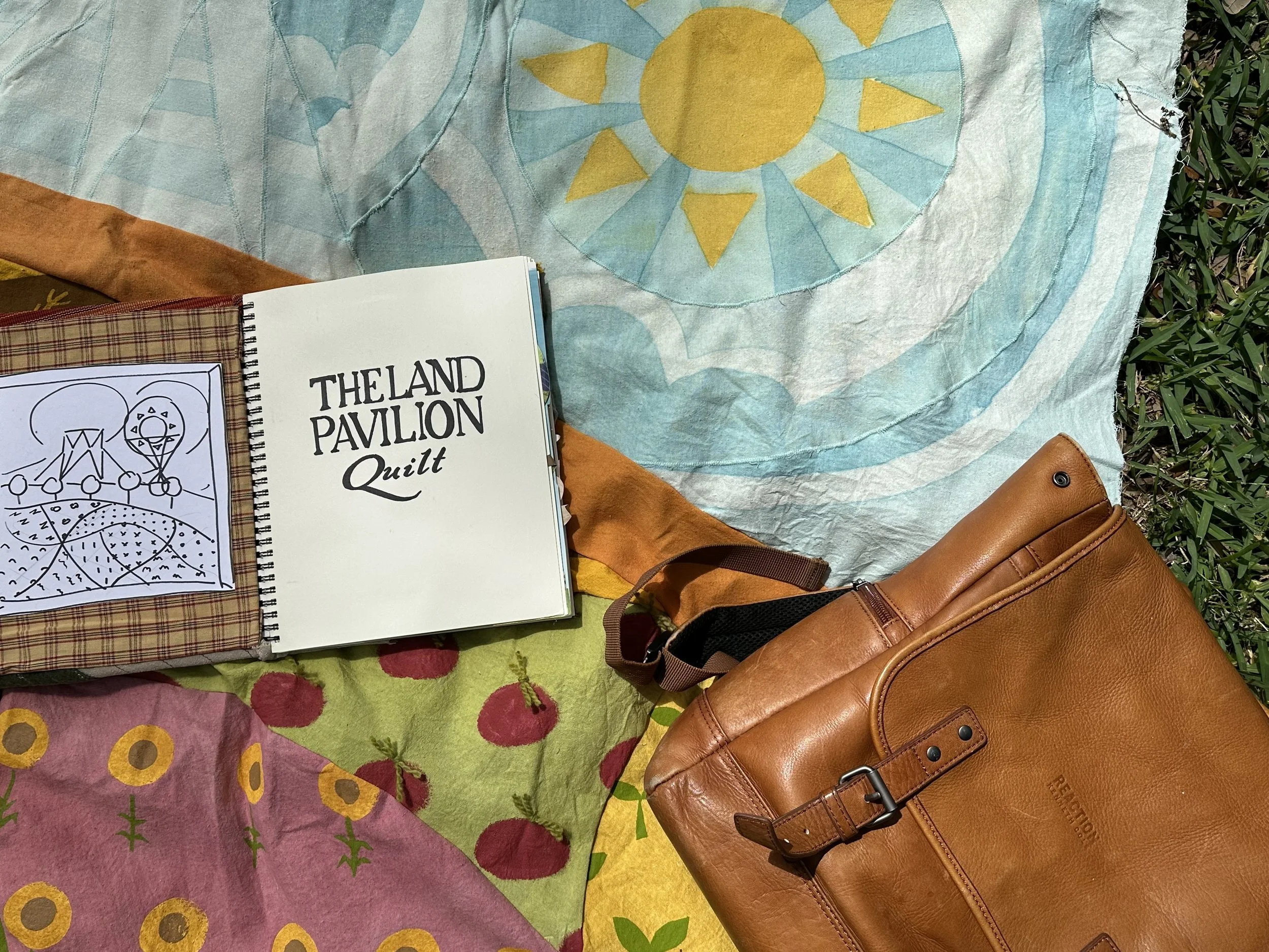 Inspired by the building of the same name at Walt Disney World’s EPCOT, The Land Pavilion Quilt is a patchwork of hand dyed, screen printed, and painted raw silk. The composition both features the building and takes design queues from the original 1982 interior of the space, with references to the cloud mural by artist Walt Peregoy and carpet wall by Doris Hardoon.