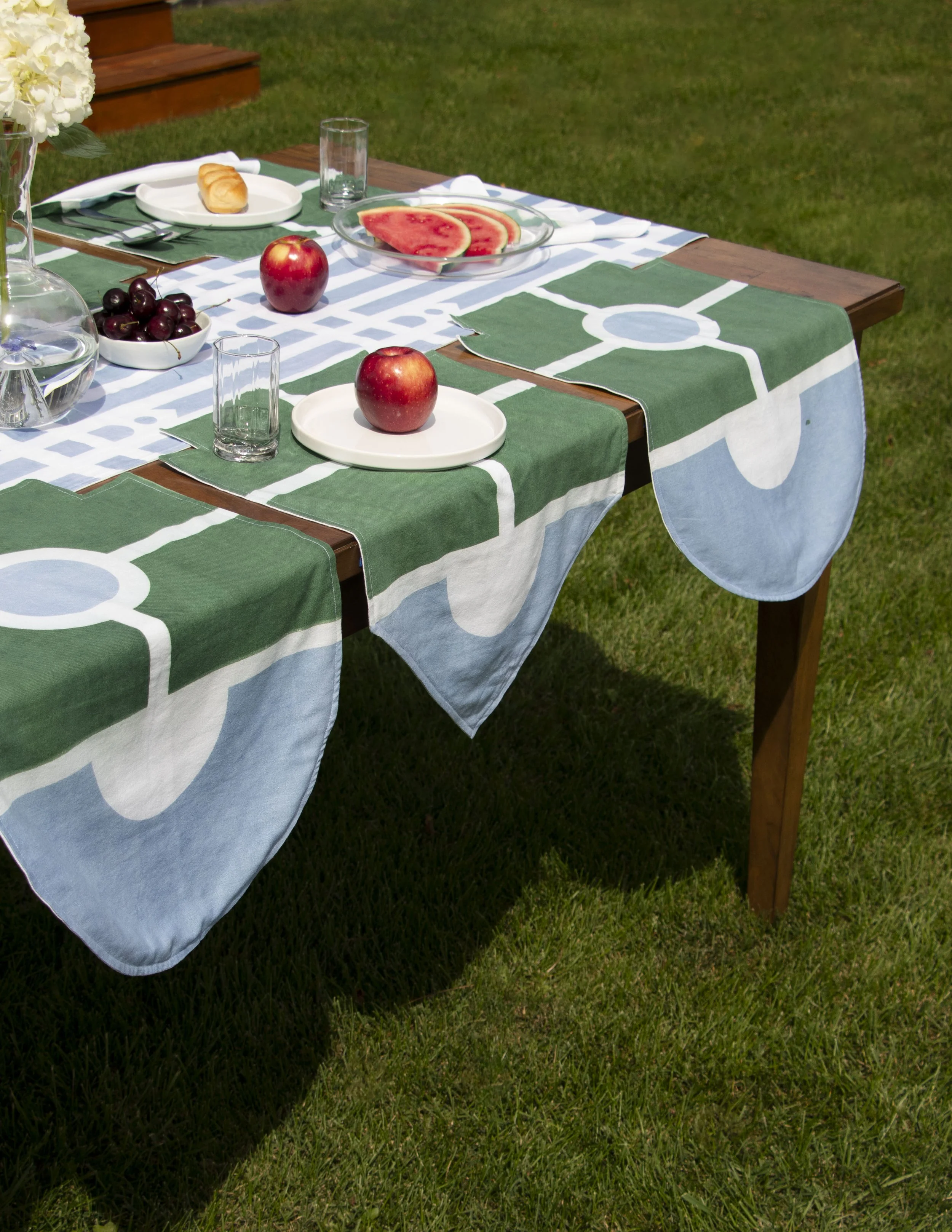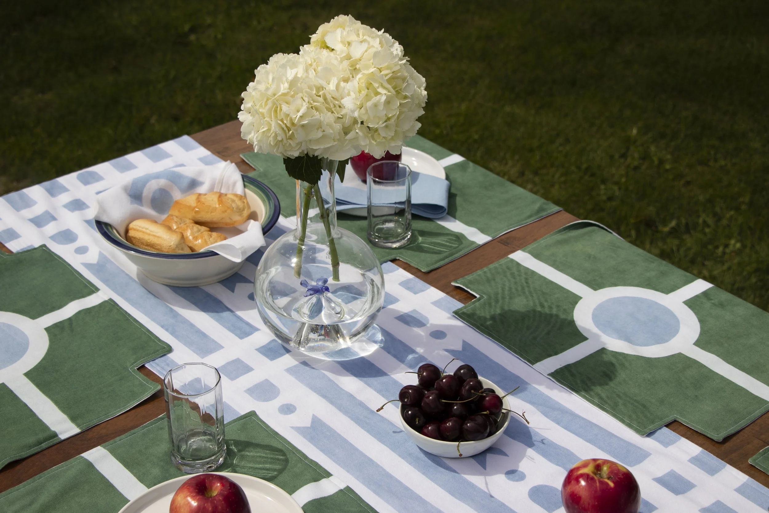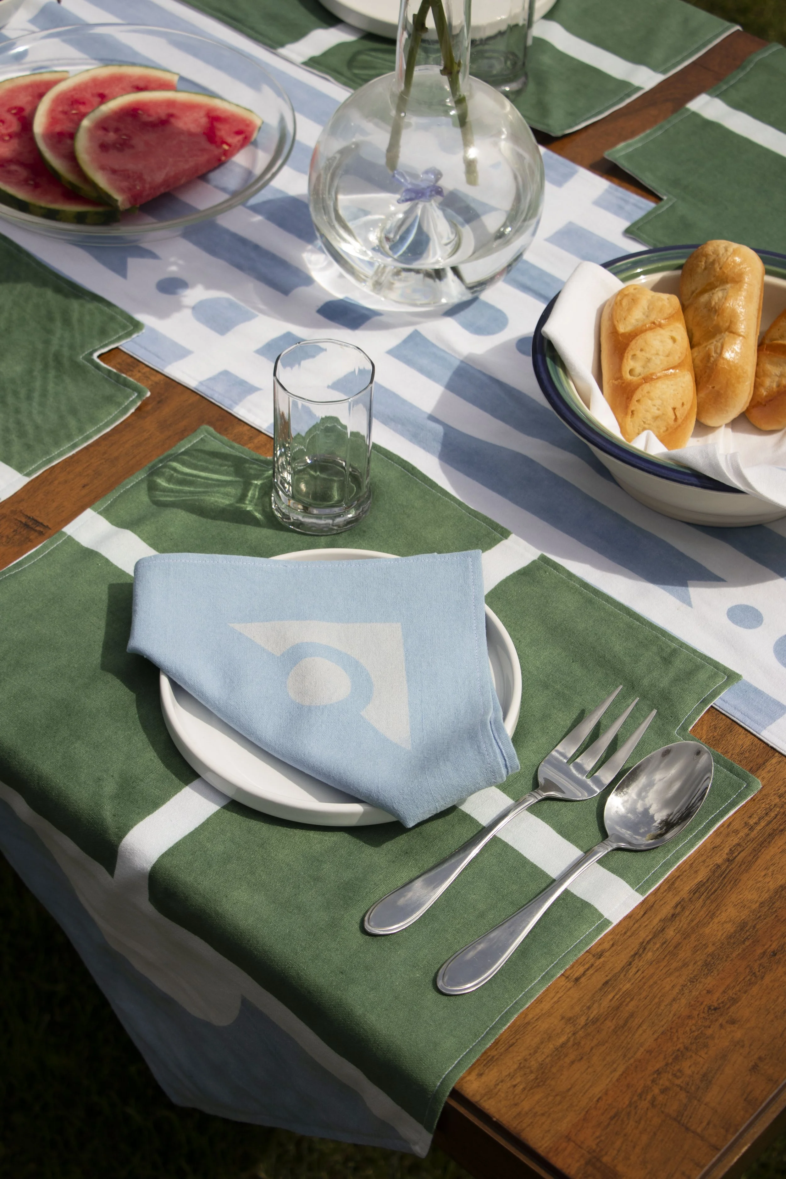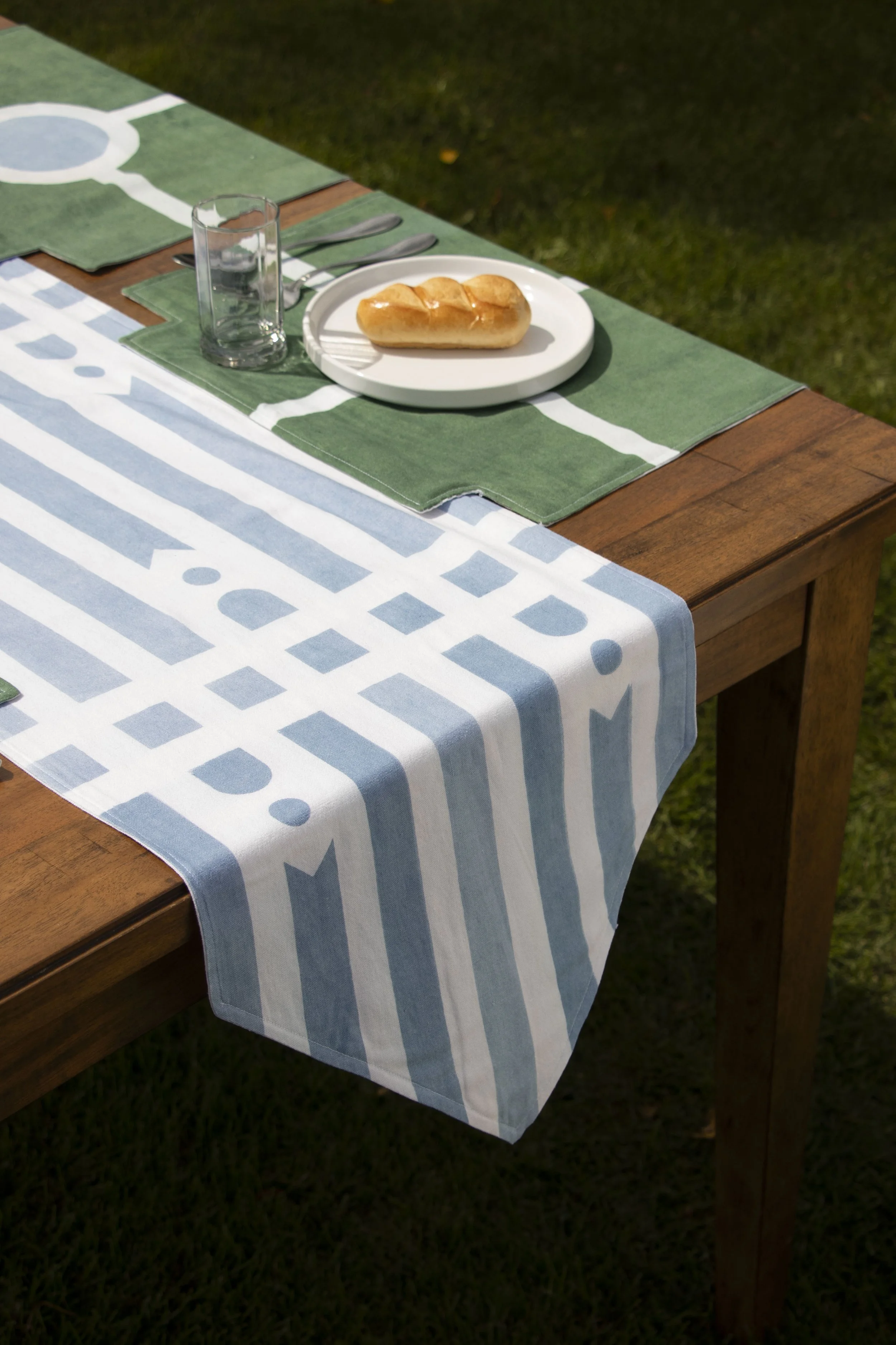 Following a similar vein as the Carpet, the Table Linens utilize the same graphic language of roadways, gardens, and architectural vignettes. The runner features the stripe pattern from the print collection, with the addition of perpendicular lines which divide the sections of the table. While the placemats are fairly simple on their own, together they create visual connections across the table, driving home a sense of community, with a touch of whimsy via the “banner” ends draping over the edge.