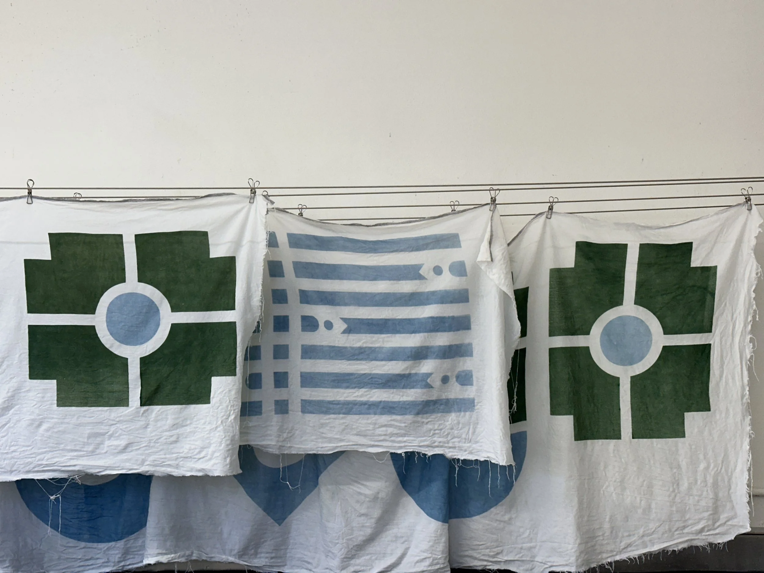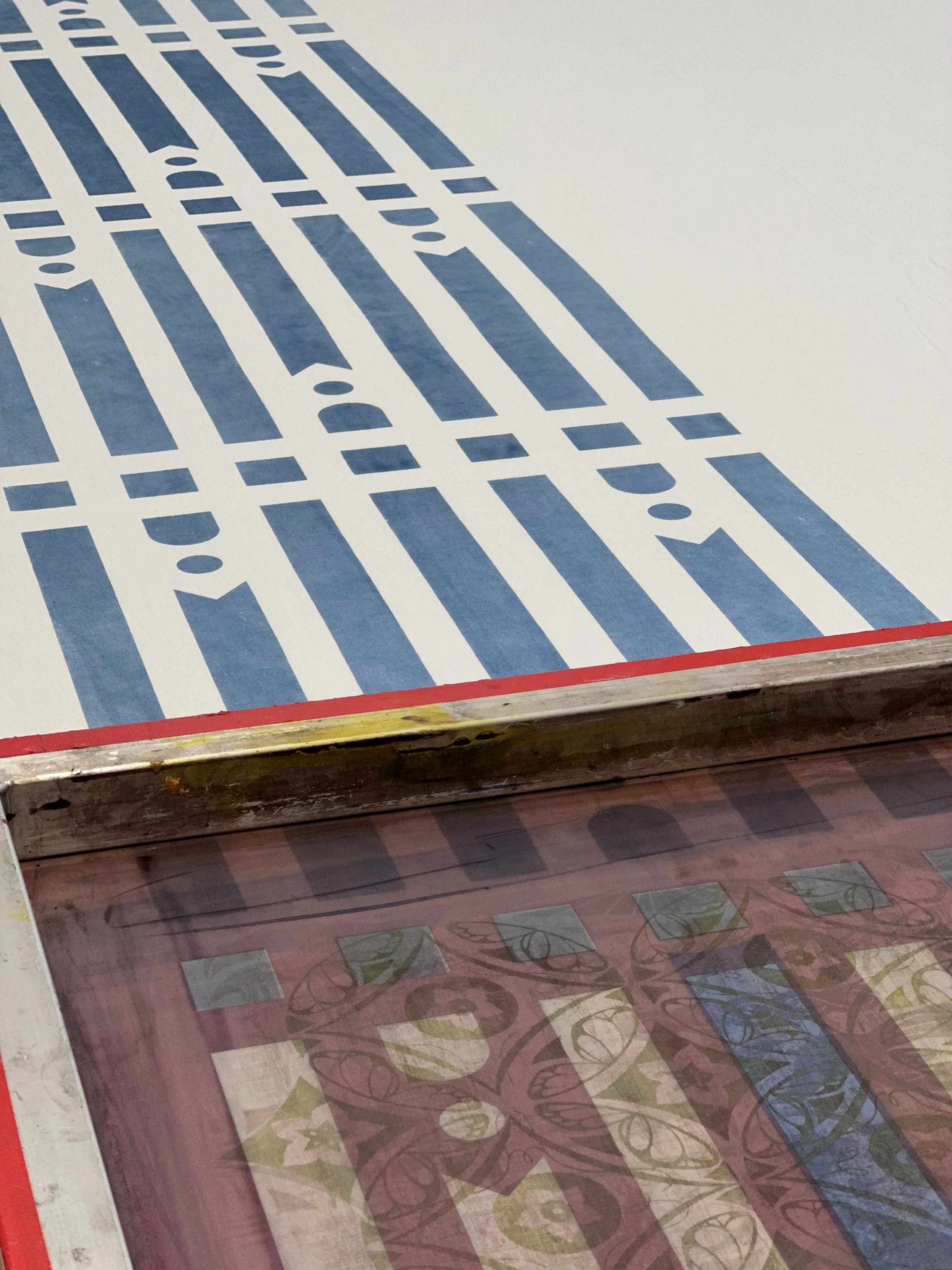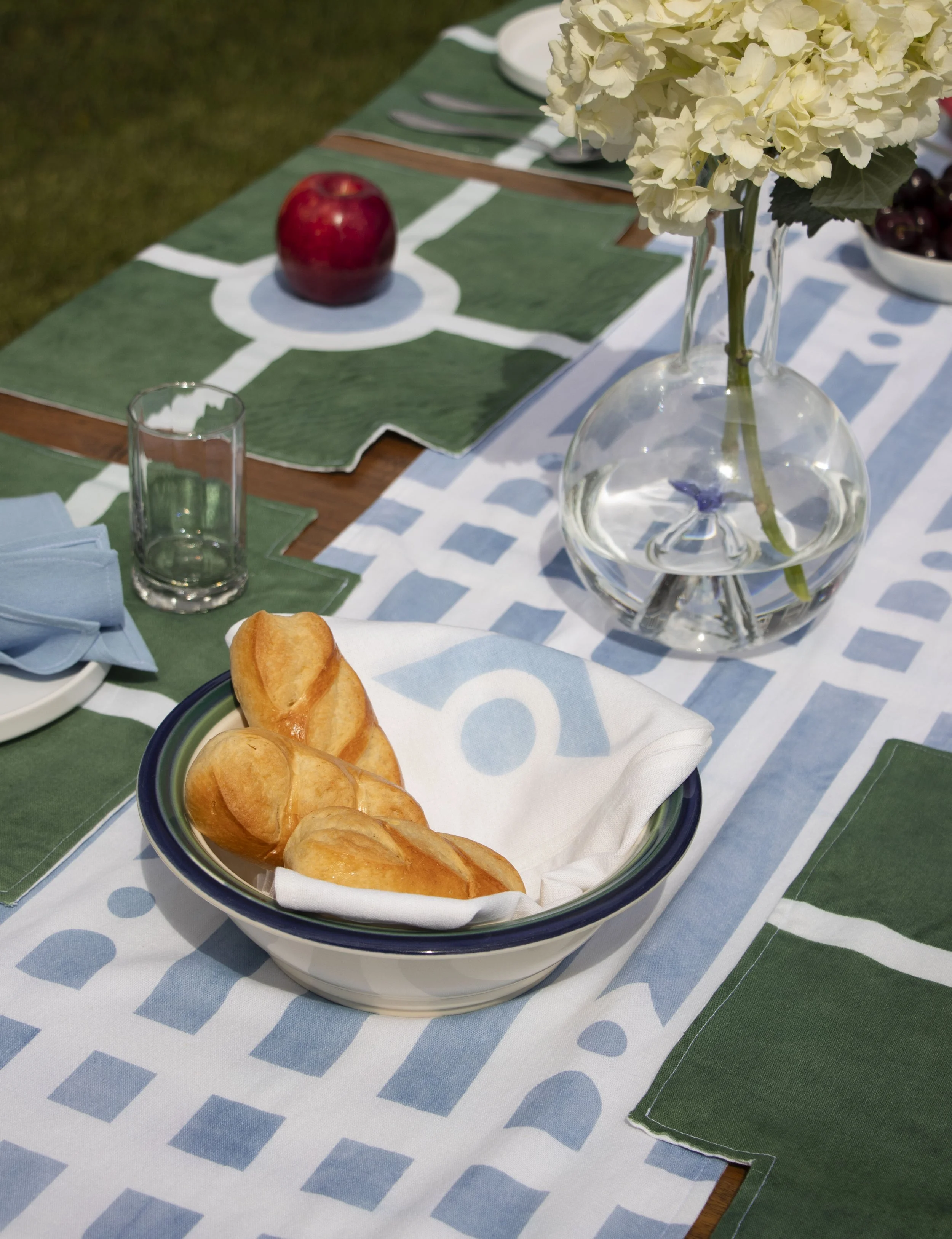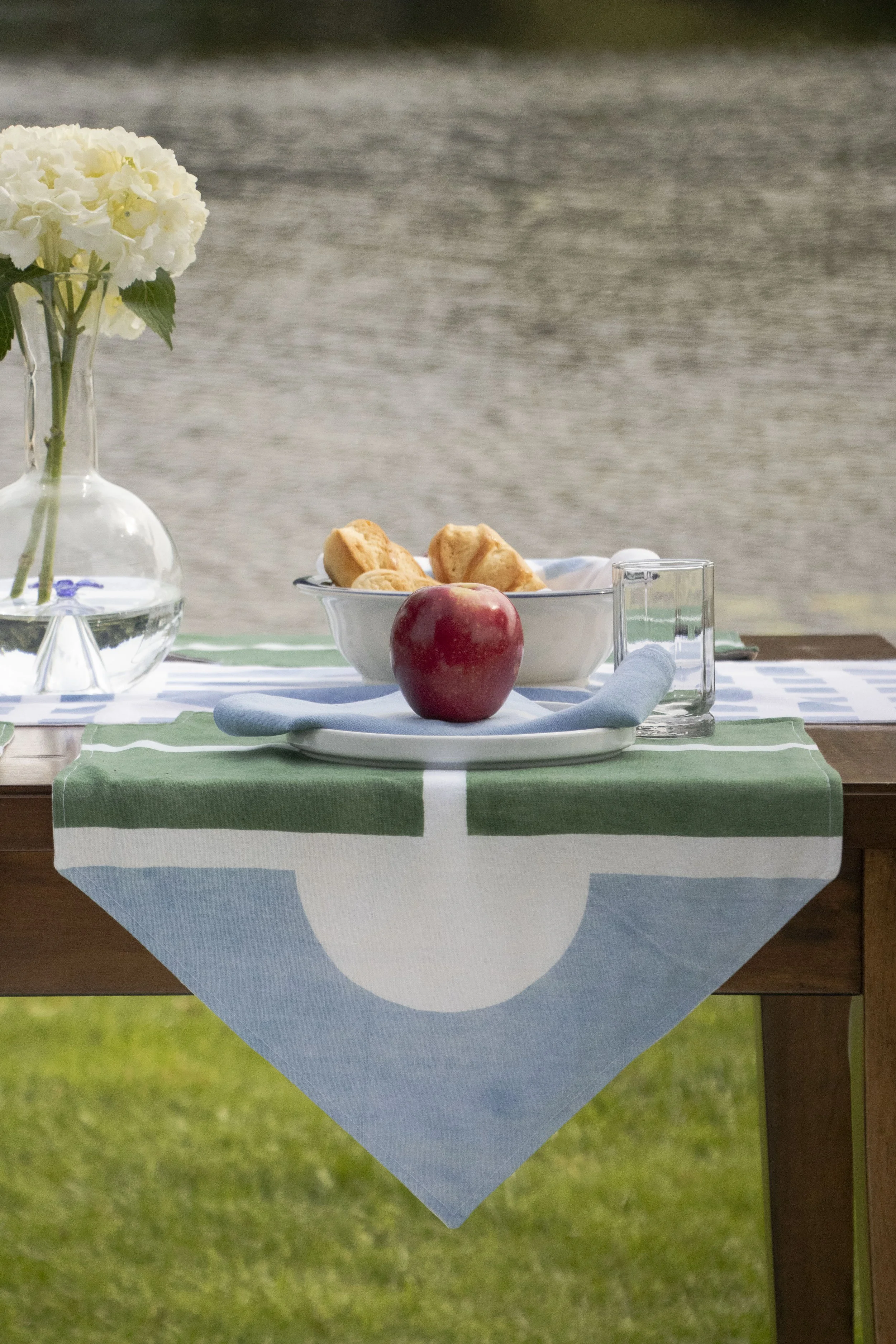 Following a similar vein as the Carpet, the Table Linens utilize the same graphic language of roadways, gardens, and architectural vignettes. The runner features the stripe pattern from the print collection, with the addition of perpendicular lines which divide the sections of the table. While the placemats are fairly simple on their own, together they create visual connections across the table, driving home a sense of community, with a touch of whimsy via the “banner” ends draping over the edge.